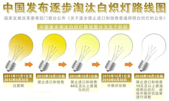 ? 據(jù)了解,這些年來世界各國對健康照明、節(jié)能減排的倡導(dǎo)和推動均可謂不遺余力,針對LED照明的相關(guān)扶持政策也紛紛出臺。當(dāng)中,中國大陸方面,在2011年的11月,國家發(fā)展改革委等多部門就聯(lián)合公布了5年內(nèi)徹底淘汰白熾燈的路線圖。中國臺灣也規(guī)劃了于2010年開始執(zhí)行的白熾燈禁產(chǎn)政策,到2012年,耗電較多的傳統(tǒng)白熾燈就將全面停產(chǎn)、禁用。日本政府亦擬在2020年以后禁止生產(chǎn)和進(jìn)口耗能較大的白熾燈和熒光燈,并早在2008年就發(fā)下條文,要求在2012年全面禁止使用白熾燈,大力推廣LED 燈泡。而韓國方面此前也宣布了在2013年底前禁止使用白熾燈。